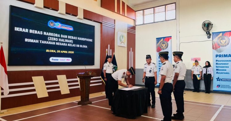 BLORA – Rumah Tahanan Negara (Rutan) Kelas IIB Blora menggelar kegiatan pelaksanaan Ikrar Zero Halinar yang berlangsung di Aula Rutan Blora, Senin (20/4/2026). Kegiatan ini dilaksanakan sebagai bentuk komitmen bersama dalam mewujudkan lingkungan pemasyarakatan yang bersih dari peredaran narkoba, praktik pungutan liar (pungli) dan penggunaan handphone ilegal.
